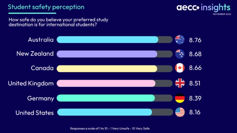 AECC(AECC Insights Student Survey)近日發(fā)布的《全球留學(xué)趨勢(shì)報(bào)告》中顯示,澳大利亞以8.76分(滿(mǎn)分10分)的高分位居榜首,被認(rèn)為是最安全的留學(xué)目的地;
